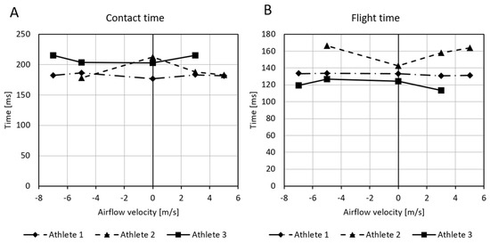 Contact times (A) and flight phases (B) of individual athletes depending on aerodynamic characteristics.
