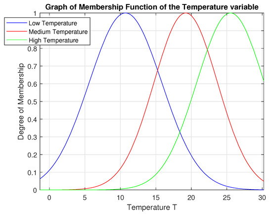 The Membership Function of the Temperature Variable is the Gaussian membership functions , from which the standard deviation, σ, and mean, c are gaussmf[5.122 10.72], gaussmf[4.481 19.21], gaussmf[4.768 25.52], respectively.