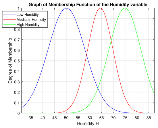 Fuzzy sets with Gaussian membership functions were used in order to be normalized between the values [0, 1]. The language variables used were low, medium, and high for the temperature and the humidity, respectively.