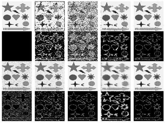 - Mafi, M.; Rajaei, H.; Cabrerizo, M.; Malek, A. A Robust Edge Detection Approach in the Presence of High Impulse Noise Intensity through Switching Adaptive Median and Fixed Weighted Mean Filtering. IEEE Trans. Image Process. 2018, 27, 5475–5490. [Google Scholar] [CrossRef]