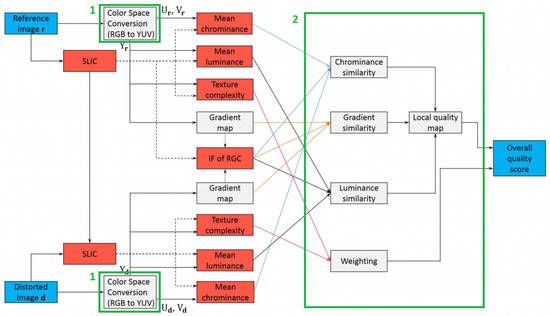 Many IQA measures work as follows: determine local distortions in the images, build similarity maps and implement a pooling strategy based on mean, weighted mean, standard deviation, etc. An example of this approach to IQA index modeling is the Mean Deviation Similarity Index (MDSI) mentioned in the previous section [7]. The calculation of MDSI starts with the conversion of the RGB color space components of the input images to a luminance component: