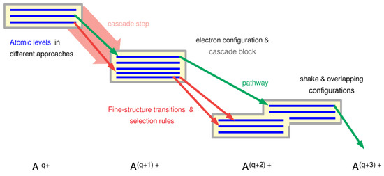 Important building blocks of all cascade computations. Each cascade is formed by the—list of energetically sorted—levels of electron configurations (blue lines in yellow boxes) from neighbored charge states. These levels are connected to each by fine-structure transitions (red and green arrows, often called lines below) of different kind, and where the number of these transitions rapidly increases with the number of the initial- and final-state levels of the associated configurations. A pathway (green arrows) decribes a possible decay path of an atom and it connects three or more fine-structure levels by different excitation and/or decay processes. Moreover, one or several electron configurations can be comprised together into a single cascade block (gray frames) to properly deal with inter-electronic correlations, but to ensure that each level just belongs to one block. Apart from those configurations of an atomic cascade, which are readily derived from the atomic shell model, further shake configurations can also be considered, although this incorporation typically results in a sizeable increase of the overall complexity. Finally, pairs of cascade blocks give rise to one or several cascade steps (wide light-red arrow) in order to deal with the different atomic processes, and that occur during the relaxation of the atom or ion. The formal decomposition of a cascade into these building blocks suggests various cascade approaches, as explained in the text below.