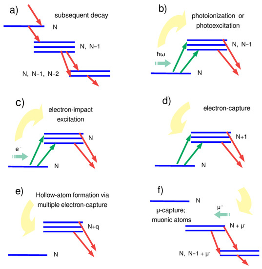 Simplified view of frequently occuring cascade schemes. Apart from (a) the stepwise decay of an initial N-electron hole-state configuration of an ion via two or more intermediate cascade blocks, including bound levels with less than (the initially) N electrons, these schemes also help account for the excitation of the atoms or ions. Such an excitation may arise from the (b) photoexcitation or photoionization, (c) electron-impact excitation, (d) radiative or dielectronic capture of electrons, (e) the formation of hollow ions via multiple electron capture, or (f) by a muon capture.