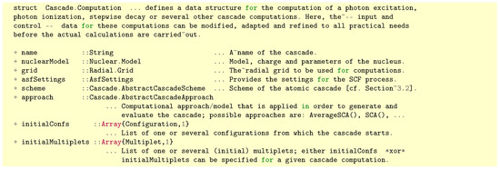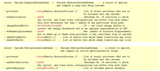 For modeling advanced atomic cascades, we already saw that we need to separate the (physics) scenario, e.g., the set-up and computation of the cascade tree, from the subsequent simulations as well as the display of the requested spectra. Moreover, often, cascade computations have to be done for different schemes to first generate all of the required hole-state configurations or levels, and that then relax by a stepwise decay scheme towards some final ionic levels; cf. Section 3.2. To perform such calculations, Jac provides the data structure Cascade.Computation that enables the user to specify a (cascade) scheme and approach, along with all further input parameters. Figure 3 shows the internal definition of this data structure, while Table 1 displays a number of frequently occuring cascade schemes that are (partly) implemented and supported by the Jac toolbox. All of these schemes are subtypes of an abstract data structure AbstractCascadeScheme and they are used to set the input data that are specific for a given casade computation. Figure 4 displays the explicit internal definition of two of these subtypes (schemes), namely the StepwiseDecayScheme and the PhotonIonizationScheme.