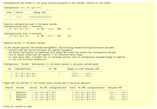 During the computation, a good deal of information is printed to screen (or, more precisely, to the standard out stream) and, if requested, also to a summary file. Figure 5 displays a minor part of this output that the user should check for the consistency of the input data and computations that are done internally. Apart from the initial levels (multiplet), this standard printout list the (tree of) electron configurations, the generated blocks and steps of the cascade, as well as a summary of all generated continuum orbitals and transition amplitudes. This enables the user to analyze and follow the computations and to understand possible bottlenecks due to the specification and size of the internal steps. Moreover, in the course of these computations, many decisions are made on the basis of default values, which can be overwritten within the code and that may also affect the final results. In particular, the (default) assumptions of the various cascade approaches can be overwritten quite easily, concerning, for instance—the number and type of—the multipoles, a maximum number of partial waves, or how these continuum orbitals are to be generated.