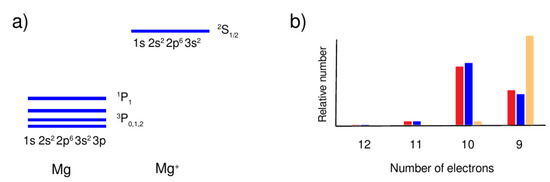 At the atomic scale, many of these observations can be perceived within the atomic shell model, and by just taking the level structure into account due to the coupling of electrons. In the shell model, the occupation of (sub-) shells is normally described in terms of electron configurations, such as for the ground configuration of atomic magnesium and magnesium-like ions. Indeed, the use of these (electron) configurations is very crucial to make atomic cascades computable and to extract the requested information about them [27,28]. Each configuration generally comprises (one or) several levels that can be temporarely occupied by a cascade owing to different fine-structure transitions, i.e., due to the electron or photon emission and, hence, the decay of levels from some energetically high-lying configuration. These fine-structure transitions form the observed (line) spectra and will be briefly referred to as lines below. Moreover, all of these transitions typically connect two well-defined initial and final levels from the corresponding configurations (multiplets) and, more often than not, also contain different channels (sublines), for instance, due to occurence of different multipoles in the decomposition of the radiation field or partial waves in the expansion of the outgoing electron waves.