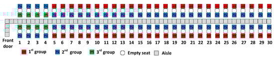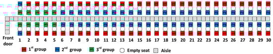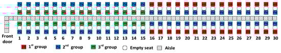 The methods featuring a “by group” rule impose a division of the passengers into groups based on their assigned seats. The division can be made following simple rules such as: all the passengers with seats near the window belong to the first group, all the passengers with middle seats belong to the second group, and all the passengers with aisle seats belong to the third group. This division is known as the WilMA (Window-Middle-Aisle) boarding method []. Another well-known “by group” method requires the division of the passengers into groups based on the rows in which they have a seat: rear, middle, or front, and this is the case for the back-to-front boarding method.