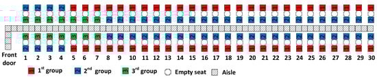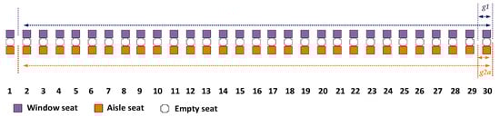 Observing the measures employed by the airlines and the passengers’ expectations, two common practices for social distancing are: keeping a minimum distance among the passengers walking down the aisle to their assigned seats and keeping the middle seat between passengers empty [].