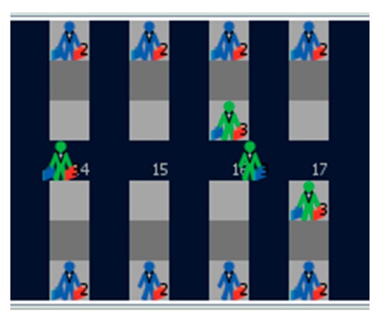 The speed of an agent is 1 patch/tick when the agent is not carrying any luggage. When an agent is carrying luggage, its speed is reduced to 0.6–0.9 patch/tick (modeled using the uniform probability distribution) [,]. In the case in which a passenger closely follows a slower passenger, the faster passenger’s speed will be reduced to maintain the imposed aisle social distance. The speed will become zero when the path of the agent is blocked by another agent and when the agent has reached its assigned seat. Additionally, the agents are not allowed to pass another agent in the aisle.