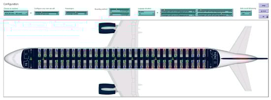 As for the assumptions made when building the models used for simulating the passengers’ boarding, various conditions have been considered in the research literature, such as: passengers’ personal characteristics [,], the presence and/or the quantity of carry-on luggage brought inside the airplane [,,,], airplane occupancy rates [,,], airplane characteristics [,,], and seat and/or aisle interferences [,,,].