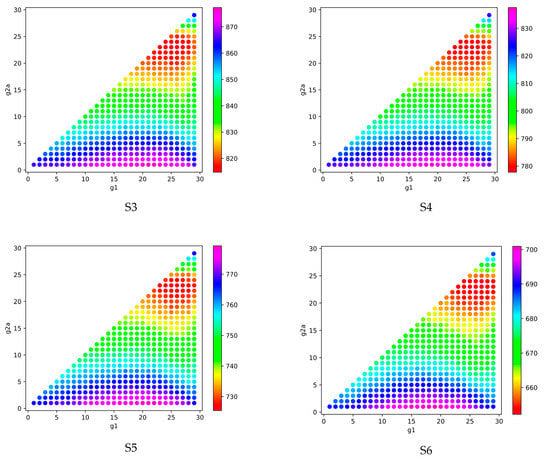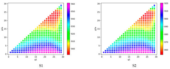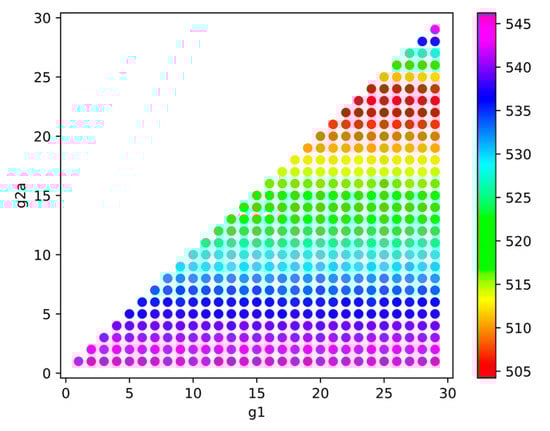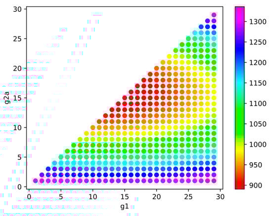 As described above near the beginning of Section 3, the decision variables g1 and g2a refer to the number of window seat passengers on each side of the aisle allocated to the first boarding group of passengers and the number of aisle seat passengers on each side of the aisle allocated to the second boarding group. The effectiveness of the particular combination of values chosen for g1 and g2a varies according to the aisle social distance and luggage scenarios. These combinations are evaluated based on the relative preference for the performance metrics. These preferences are expressed through user-specified weights. The weight applies to BoardingTime, applies to , and applies to . All of these performance metrics are expressed in seconds. The objective function, F, is a weighted average of the metrics as follows: