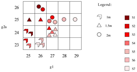 The following results of full grid simulations are available as Supplementary Materials. The following are available online at https://www.mdpi.com/article/10.3390/sym13040544/s1, For Figures S3, S6, and S9, the results for S7 luggage scenario are included in the main body of the manuscript and thus omitted from the Supplementary Materials. Figure S1: The performance (in colors) of the g1, g2a combinations when the objective function is determined by weights = 100%, = 0%, and = 0%, for the S1–S7 luggage scenarios, 1.5 m aisle social distance. Figure S2: The performance (in colors) of the g1, g2a combinations when the objective function is determined by weights = 100%, = 0%, and = 0%, for the S1–S7 luggage scenarios, 2 m aisle social distance. Figure S3: The performance (in colors) of the g1, g2a combinations when the objective function is determined by weights = 0%, = 100%, and = 0%, for the S1–S6 luggage scenarios, 1 m aisle social distance. Figure S4: The performance (in colors) of the g1, g2a combinations when the objective function is determined by weights = 0%, = 100%, and = 0%, for the S1–S7 luggage scenarios, 1.5 m aisle social distance. Figure S5: The performance (in colors) of the g1, g2a combinations when the objective function is determined by weights = 0%, = 100%, and = 0%, for the S1–S7 luggage scenarios, 2 m aisle social distance. Figure S6: The performance (in colors) of the g1, g2a combinations when the objective function is determined by weights = 0%, = 0%, and = 100%, for the S1–S6 luggage scenarios, 1 m aisle social distance. Figure S7: The performance (in colors) of the g1, g2a combinations when the objective function is determined by weights = 0%, = 0%, and = 100%, for the S1–S7 luggage scenarios, 1.5 m aisle social distance. Figure S8: The performance (in colors) of the g1, g2a combinations when the objective function is determined by weights = 0%, = 0%, and = 100%, for the S1–S7 luggage scenarios, 2 m aisle social distance. Figure S9: The performance (in colors) of the g1, g2a combinations when the objective function is determined by weights = 60%, = 35%, and = 5%, for the S1–S6 luggage scenarios, 1 m aisle social distance. Figure S10: The performance (in colors) of the g1, g2a combinations when the objective function is determined by weights = 60%, = 35%, and = 5%, for the S1–S7 luggage scenarios, 1.5 m aisle social distance. Figure S11: The performance (in colors) of the g1, g2a combinations when the objective function is determined by weights = 60%, = 35%, and = 5%, for the S1–S7 luggage scenarios, 2 m aisle social distance. Video V1: Agent-based boarding for S1 luggage situation, 1 m aisle social distance, g1 = 25 and g2a = 24. Video V2: Agent-based boarding for S3 luggage situation, 1.5 m aisle social distance, g1 = 15 and g2a = 15. Video V3: Agent-based boarding for S2 luggage situation, 1 m aisle social distance, g1 = 26 and g2a = 26. The videos can be accessed at the following link: https://github.com/liviucotfas/symmetry-social-distance-luggage-reverse-pyramid-3-groups (accessed on 26 February 2021).