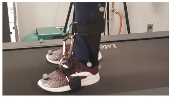 An ankle brace that restricted ankle joint range of motion was custom-made in the Biomechanics Laboratory at CSU, San Marcos. The brace was made from a single piece of moldable thermoplastic which included (1) a foot region that was designed to be placed inside the shoe, (2) rigid straps wrapped about the forefoot on the outside of the shoe, (3) a region surrounding the upper shank, and (4) rigid straps connecting the forefoot and shank region while opposing ankle plantarflexion (Figure 1). The brace was placed on the left ankle during the ankle brace trials. Restricting ankle range of motion to a total of 17° or less will significantly decrease the ability of the ankle joint to produce adequate propulsion force [40,52,53,54]. In the current study, the ankle brace reduced participants’ ankle joint range of motion by 39%, from an average of 26.45 ± 3.82° to an average of 16.05 ± 2.66° while walking on the nonoscillating treadmill. The dominant limb of each participant was not determined; therefore, it is possible that the ankle weight and brace were placed on the dominant limb for some participants, and the nondominant limb for others.