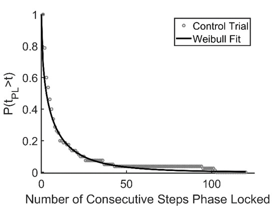 Unintentional synchronization of gait between an individual and an external cue or between two individuals walking side by side is typically transient in nature [34,51]. Recently, we described several different patterns of synchronized behavior observed as a person walked on the oscillating platform, referring to periods of synchronization as laminar phases [34]. In the current analysis, laminar phase lengths (i.e., the duration of each period of phase locked synchronization) were used to construct a survival function P(tpl > t), in which the proportion of laminar phases (tpl) that persisted for longer than each unit of time (t, expressed in terms of steps) were plotted and fit to the Weibull survival function: