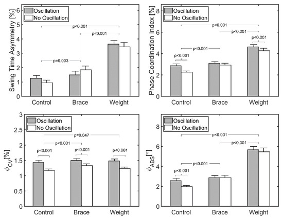 An alternative explanation for an increase in PCI and might be derived from studies of rhythmic auditory stimulation (RAS) and its effect on temporal gait asymmetry (TGA) in patients following stroke [28,29,30]. RAS has been shown to have a relatively large impact on several aspects of gait in poststroke patients [29], but to date most studies have reported only a modest impact on TGA [30]. This may be related to a limitation in beat perception and production (i.e., rhythm ability) for certain patients, and individuals with weak perception or production often exhibit an increase in “beat-to-step” temporal variability [28,59]. While the participants included here were healthy, variations in rhythmic ability exist within the nonimpaired population [60,61], and this may affect movement variability in response to an external cue. In addition, rhythmic ability is related to a cyclical interaction between the perception of one’s environment, generation of action, and the impact of that action on the environment [62,63]. Any novel change to the environment or lower limb requires an adjustment of this perception–action coupling [64]. It is possible that participants did not have sufficient practice to adapt this perception–action coupling for each of the novel situations they experienced (oscillation, unilateral weight and brace), and this led to a reduction in rhythmic ability.