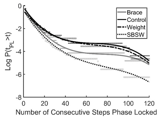 Repeated measures ANOVA showed no statistically significant difference in phase locking between any of the three perturbed walking conditions during the oscillation of the treadmill (p = 0.38), with means of 35.49 ± 33.27%, 44.47 ± 31.28%, and 43.09 ± 33.21% for the control, brace, and weight conditions, respectively (Table 3). Additionally, frequency locking was not significantly different (p = 0.23) between the three conditions during the oscillation of the treadmill, with means of 94.98 ± 17.79%, 88.94 ± 25.75%, and 93.04 ± 19.20% for the control, brace, and weight conditions, respectively (Table 3). Analysis of survival curves indicated the greatest laminar phase length occurred during the control trials, while the shortest average laminar phase occurred during the brace trials. The predicted laminar phase length underestimated the measured lengths by approximately two steps in all three walking conditions (Table 3). The greatest disparity between the predicted and actual laminar phase length occurred during the brace trials (2.17 steps), and the lowest disparity occurred during the weight trials (1.96 steps).