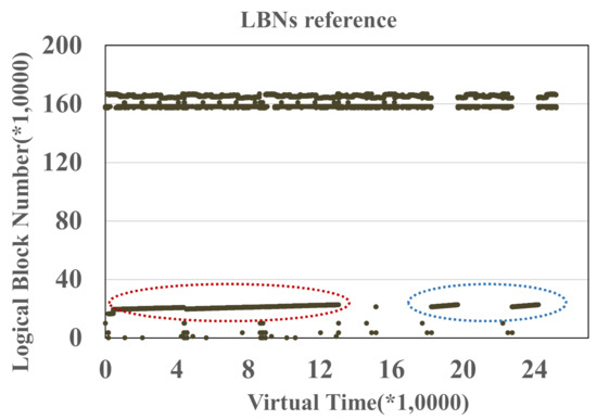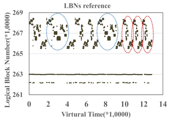 For the first identification technique, file hints made in user space, the management granularity is each file as it is hard to separate individual file in a fine-grained manner, such as a file page unit. In our test, a single file has several data patterns. Figure 2 and Figure 3 show the address-time graph of I/O workloads collected from two applications, cscope and glimpse, respectively. In the Cscope and Glimpse workloads, we enclose those I/Os from the same program counter. In Figure 2, data enclosed by the red and blue ovals belong to the same LBN scope from a single file. That is to say, data in a single file could be indexed by various PCs (various PCs represent different data patterns). In Figure 3, there is the same situation that a single file has at least two kinds of patterns enclosed by red and blue ovals. Therefore, the manual file hints in user space are not reasonable.