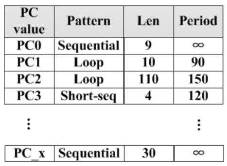 In Figure 4, Buffer Commander conducts the buffer according to PC Manager Table, in which all the related parameters of PCs trained by PC Classifier are listed. PC0 is a sequential reference as it has ’∞’ as its loop period. PC1 and PC2 are loop references with loop periods of 90 and 150, respectively. PC3 has a loop period of 120. In our second step of Figure 4, after calculating a PC value, if this PC value hits in PC Manager Table, this table can directly provide PC features for Buffer Commander without training overhead.