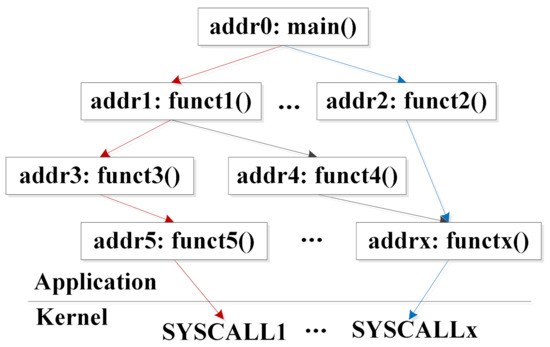 As shown in Figure 6, one application can be interpreted as a function call tree. Among it, two function call routines have been marked by red and blue colors. Each routine is composed of several functions. In addition, the address values of these functions can be searched in virtual address space. For example, the red function routine contains a set of functions, ’funct5()-funct3()-funct1()-main()’, and its address list is ’addr5-addr3-addr1-addr0’. Each routine can be uniquely identified and represented by the sum of function addresses, called a PC value in this article. During the process of PC exploration, there is a key insight that in most applications, a few dominant I/O activities exist and most dominant I/O activities have definite data access patterns [26]. These dominant I/O activities are represented by the PC values. In conclusion, working out a PC indicator for each request invoked by a ’SYSCALL’ is the task of the PC Calculator module.