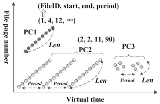 PC1 represents a sequential pattern, in which consecutive block references only occur once. PC2 indicates a loop pattern, according to which sequential references occur repeatedly with a regular interval, named as Period. We use the ‘virtual time’ to describe the ‘period’ field. The ‘virtual time’ is not real time, but the page sequence. The ‘period’ field implies the average of the intervals between the same data accesses. PC3 describes a short sequential pattern. The len parameter is to describe the sequential length for loop and sequential patterns. Except for the three detected patterns, other patterns are not our goals which have no clear repeated regularities, named as ’Rand’ patterns. The ‘Pattern Classifier’ module keeps updating the ‘PC Manager Table’ while AOIO is running. If the pattern of a file has been changed by another application, then ‘Pattern Classifier’ module will update and modify the changed pattern in ‘PC Manager Table’ directly.