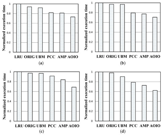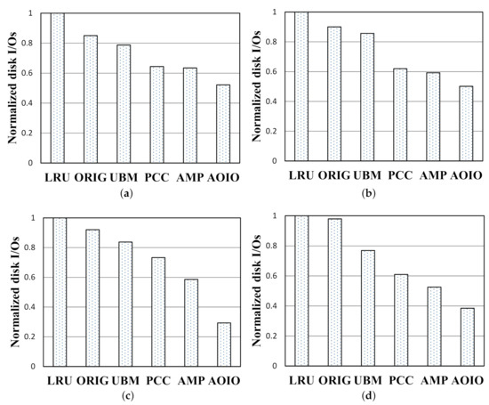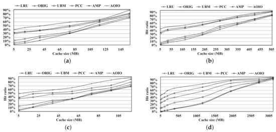At last, as AMP has the best performance except AOIO, we choose the points on the X-axis where the performance gaps between AMP and AOIO are the biggest in our tests as our comparison points. For example, by observing the test results in Figure 9c, at about 97 MB point of X-axis, the performance of AOIO increases by 29%, 27%, 26%, 21%, and 14%, compared with LRU, ORIG, UBM, PCC, and AMP, respectively. From the Figure 9d results, under about 7.8 MB cache, we can find the performance of AOIO has been improved by 46%, 45%, 37%, 17%, and 14%, compared with LRU, ORIG, UBM, PCC, and AMP. In the view of AOIO, compared with other policies, the average hit ratio improvement is 25.9%.