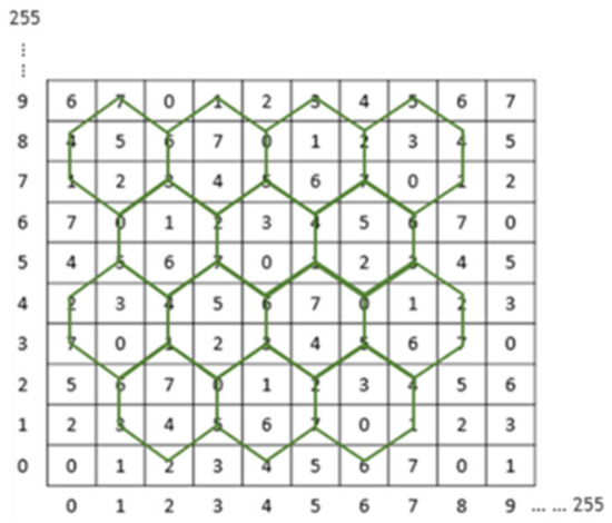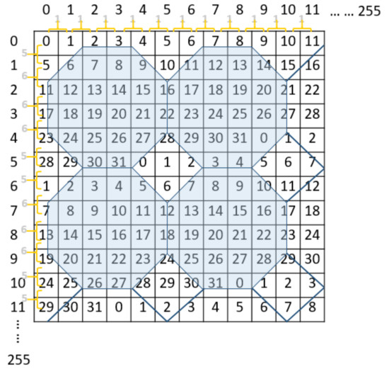 As shown in Figure 2, Leng [12] constructed a reference matrix M in the size of 256 × 256 based on regular octagon-shaped shells for hiding secret data. The construction rules were as follows: In the same row of the reference matrix M, the value difference between two adjacent elements was set to “1”, and the value difference between two adjacent elements in the same column was set to “5”, followed by “6”, “6”, “6”, and “5” in repeated cycles. The reference matrix M composed of a number of contiguous regular octagon-shaped shells. Each regular octagon-shaped shell had a total of 32 numbers, ranging from 0–31. Once the transmission side constructed a reference matrix, the secret message was embedded into the cover image to obtain stego-image. A pair of pixels represented the values of x- and y-axes of the reference matrix coordinates, where each pixel pair corresponded to a 32-ary notational system value.