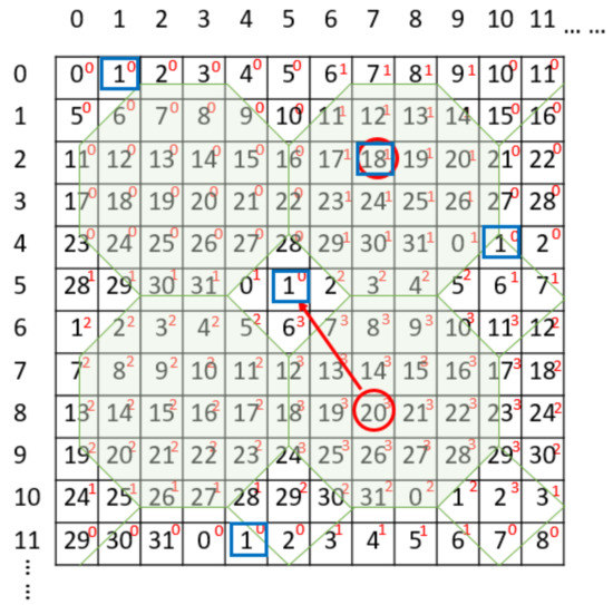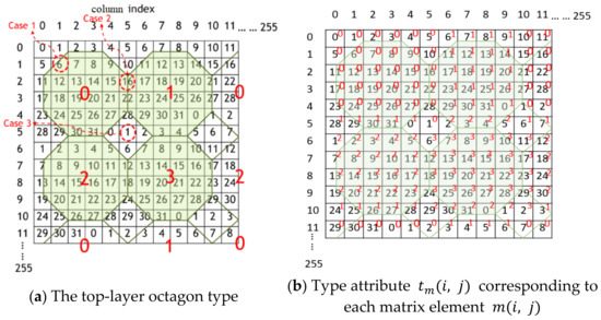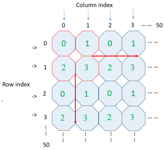 Figure 2 shows the layout of octagon-shaped shells in the reference matrix. There are octagons as shown in Figure 3. For ease of explanation, the type matrix of the octagon-shaped shell is denoted as . The type matrix is constructed using the following rules: Firstly, the values of type in the same row change according to the gradient (ascent/descent) with a magnitude of “1”. Secondly, the values of the elements in the same column change according to the gradient (ascent/descent) with a magnitude of “2”. To demonstrate an example, we take four octagons near the origin (0, 0). First, we indicate their type values as {0, 1, 2, 3}, marked by red color in Figure 3. For example, ,, , . In this manner, we assign the four octagon-based type values {0, 1, 2, 3} to the whole octagons respectively.