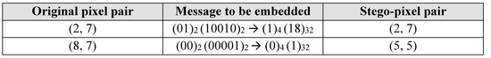 | Step 3: Divide the secret message S into sub-streams of 7 bits, where . For each sub-stream , convert the first 2 bits into a 4-ary digit and the last 5 bits into a 32-ary digit , viz., where “||” denotes the string concatenation operator. |