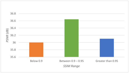 Based on the experiment on 50 test images, the SSIM values can be categorized into three groups as shown in the Figure 9. It is evident from the figure that the images which obtain SSIM values between [0.90, 0.95] are the most suitable for the proposed method as these images show the highest PSNR value. The PSNR range obtained for SSIM values between [0.90, 0.95] is [34.085597, 36.941688] dB, which falls in the acceptable image quality range.