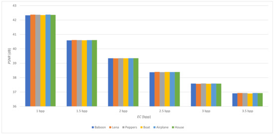 We also calculated the PSNR values for six standard test images at different EC (bpp) as shown in Figure 10 below. The figure clearly shows that as the embedding rate increases, the PSNR value decreases similar to the property of methods based on the magic matrix hiding methods of [12,13,14,15,16,17,19,20,22]. However, interestingly, the PSNR values for the test images do not have much difference from each other, which again shows the point that the PSNR values remains stable using our proposed method irrespective of the image texture.