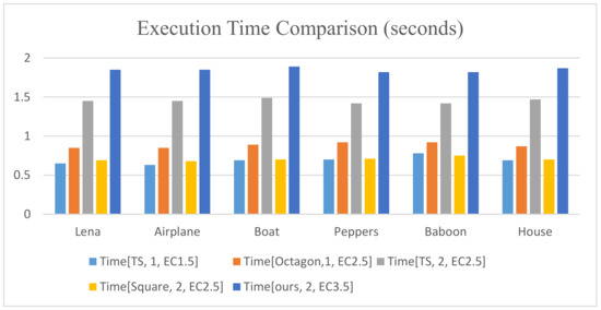 Table 4 shows the comparison of EC (bpp), PSNR (dB), and embedding time (seconds) among Chang et al.’s turtle shell in a single-layer embedding, Leng’s octagon-shaped shells scheme in a single-layer embedding, Xie et al.’s two-layer turtle shell matrix embedding, Shen et al.’s double-layer square magic matrix scheme, and the proposed method in a two-layer embedding using octagon-shaped shells. For simplicity, the representations [TS, 1, EC1.5], [Octagon, 1, EC2.5], [TS, 2, EC2.5], [Square, 2, EC2.5], [Ours, 2, EC3.5] stand for the methods exploiting Chang et al.’s turtle shell in a single-layer embedding [10] with EC = 1.5 bpp, Leng and Tseng’s octagon-shaped shells scheme in a single-layer embedding [12] with EC = 2.5 bpp, Xie et al.’s two-layer turtle shell matrix embedding [19] with EC = 2.5 bpp, Shen et al.’s double-layer square magic matrix scheme with EC = 2.5 bpp, and the proposed method in a two-layer embedding using octagon-shaped shells with EC = 3.5 bpp. As mentioned earlier, the PSNR and SSIM values of all test images remain stable for the information hiding method based on the magic matrix, under the same embedding capacity regardless of the image texture. Similarly, the execution time of each method also shows stability, which is presented in Table 4 and Figure 11.