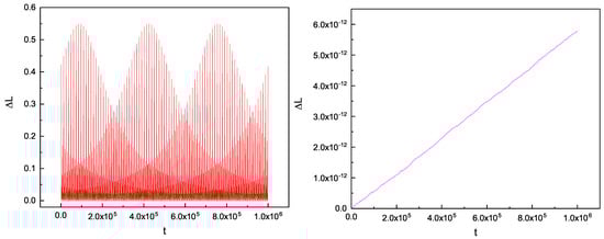 We chose the initial conditions as , , . Then, we calculate Equations (9) and (16) or Equation (8) numerically use the eighth and ninth-order Runge–Kutta–Fehlberg integration algorithm RKF8(9). From Figure 1, we find that precision of energy error is achieved of  in the coherent equations when we calculate , whereas it is 0.1 in the approximate equations. This scenario means that the coherent equations are really better than the approximate ones used in a physical system. Meanwhile, in the order of magnitude, the coherent equations are many times more accurate than the approximate equations. From Figure 2, we obtain the relations of the errors of the orbital angular momentum, and a very similar result is given as for the energy errors. From the results above, apart from the energy errors, the errors of the orbital angular momentum all present a stark contrast in terms of computational accuracy. From this point forward, to obtain more accurate descriptions, the coherent equations of motion will be a better choice in the application to physical systems. The chaotic dynamics of compact binary systems have since been investigated. As chaos is an attribute of the physical system itself, using an inadequate calculation method will likely lead to the insufficient performance of the system’s properties, especially for highly nonlinear systems, such as compact binary systems, which are extremely sensitive to initial values. Most prominently, the coherent equations of motion can not only achieve high levels of computational accuracy, but also play a useful role in energy conservation.
