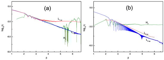 where  and  are separations between two neighboring orbits at times 0 and t. According to reference [], for a bounded orbit, it indicates that orbit is chaotic if its Lyapunov exponent is positive; conversely, the orbit is ordered when its Lyapunov exponent tends to zero. We obtain the Lyapunov exponent for the system with and without 2PN in Figure 4, respectively. Additionally, (a) is the case when the 2PN part is not included; (b) is the Lyapunov exponent when the 2PN term is added. From Figure 4a, we find that the Lyapunov exponent in the Lagrangian case with the coherent method is positive at 1PN, which indicates that its corresponding orbit is chaotic, meaning that the dynamics of the system, in this case, exhibit chaotic behavior. However, neither the Hamiltonian case of the same order nor the Lagrangian with the approximation method has a positive Lyapunov exponent and both exhibit convergence to zero. This means that their dynamics are all regular. In Figure 4b, the 2PN term is under consideration. We noticed that the Lyapunov exponent under the Hamiltonian is positive at this time, which corresponds to its chaotic orbits and dynamical behavior. For Lagrangians of the same order, they have Lyapunov exponents that tend to zero regardless of whether the approximation or coherence methods are used, which means that their orbits are ordered. Each case is calculated with time of . In Figure 4a, the system of the PN Hamiltonian formulation corresponds to a regular orbit, and it will tend to be zero with a long integration time. At 1PN, the PN Hamiltonian and coherent Lagrangian have a different dynamical characteristic for a long calculating time; when 2PN is concluded, they are also different dynamically. This indicates that the PN Hamiltonian and Lagrangian are non-equivalent in the same PN order. Note that considerable differences exist in the description of dynamics for PN Hamiltonians and Lagrangians in the same order. Theoretically, the Lyapunov exponents are the limit value, and numerical calculations take a long time to integrate. A more precise tool can be used to better determine the dynamics of physical systems and give an accuracy description for their properties.