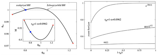 As one can see in Figure 1 (left panel), a particular configuration there has , while . This configuration is of special interest, corresponding to a scalarized BH, its profile being displayed in Figure 1 (right panel).