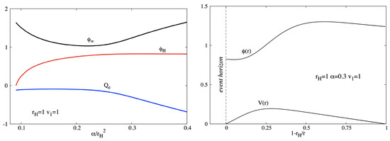 Several results in this case are displayed in Figure 1 (left panel), where we show the asymptotic value of the scalar field and mass M of the solutions as a function of the scalar field value at the horizon, . One can see that the solutions exist for a finite range of (located around the ground state ), ending in critical configurations where the condition (20) fails to be satisfied (This last feature cannot be captured within a perturbative approach).
