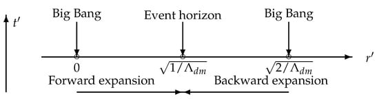 In case I of the stationary metric (59), we have r = 0 by the synchronization t = t of t and t owing to (60). If t is adjusted as t = Θ t , ( Θ > 1 ) , then we see that r moves from 0 to 1 / ( Λ d m ) as t moves from 0 to + . Similarly, in case II, we see that r moves from 2 / ( Λ d m ) to 1 / ( Λ d m ) as t moves from 0 to + . This dual structure, illustrated in Figure 1, clearly shows that by taking t = 0 as the origin of time from which twin Big Bang universes evolve, they will meet at the event horizon in (59) an eon later ( t = ). To the best of our knowledge, the concept of twin universes with matter vs. antimatter duality was first discussed by Petit [15]. We believe that his cosmological model fits exactly into the configuration illustrated in Figure 1, which tells us that ( Λ d m ) 1 is a genuine characteristic length scale of our universe. This justifies the fact that Λ d m defined in (50) is the cosmological constant that appears in the form of (49). The forward and backward time evolutions of twin universes correspond, respectively, to positive and negative field operators of the 4-momentum, while the existence of twin universes naturally explains the reason why one-sided energy spectra at the level of state vector space works for many practical situations in each universe. If the birth of these twin universes was brought about by conformal symmetry breaking of certain light fields in which the duality between “matter (with positive energy) and antimatter (with negative energy)” works as the separation rule of the twin structure, then the twin pair will return to the original light fields when they meet at the event horizon. The next Big Bangs of the twin pair will occur at certain locations on this event horizon distant from each other by 2 / Λ d m .