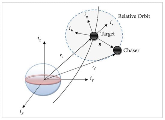 Now we will assume that the inertial references frame with origin, which coincides with the center of the main body, say Earth’s center; the orthogonal unit vector is denoted by . The vector in the direction of the equinoxes and the vectors is perpendicular to it, while passes through the North Pole. To describe a relative motion satellite in Local-Vertical-Local-Horizontal (LVLH) coordinates, we proposed that the orientation of these frame by the unit vector triad , where the vector lies in the chief radial direction, lies in the direction of the chief angular momentum, and completes the right-handed orthogonal triad, such that ; see Figure 1.