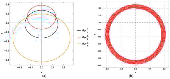 With the help of Equation (48), the initial amplitude of the chaser satellite for space rendezvous, i.e., , works similar to in the previous section with different values for the phase angle. The projection of the periodic solution in the xy-plane is shown in Figure 4, whereas the orbit in three dimensions is shown in Figure 5 with different values of phase angle.