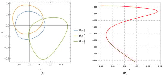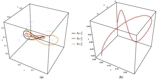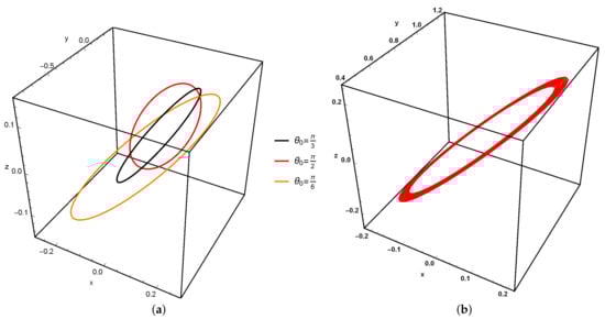 With the help of Equations (24)–(27), the initial amplitude of the chaser satellite for space rendezvous, i.e., is taken as , with different values of phase angle. The projection of the periodic solution in the xy-plane is shown in Figure 2, whereas the orbit in three dimensions is shown in Figure 3 at different values of the phase angle.