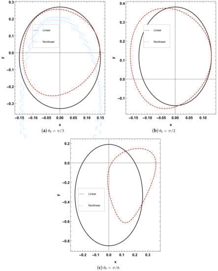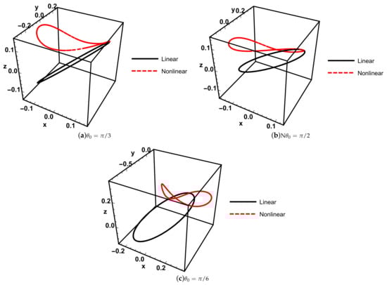 The graphical investigations in both Figure 6 and Figure 7 show that the analytical solutions of linear and nonlinear motions are periodic; however, there are differences between the style of the two motions. The periodicity of the nonlinear relative motion solutions gives a considerable verification due to the solution obtained with the Lindstedt–Poincaré technique.