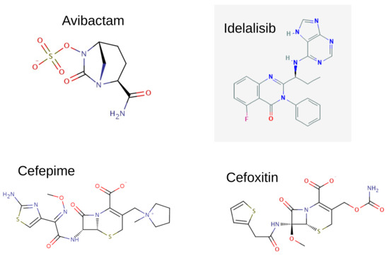 We selected avibactam as an example of a non lactam inhibitor, the two cephems, namely cefepime and cefoxitin, as examples of antibiotic molecules and idelalisb as a recent relevant anticancer active substance for the treatment of major leukemias.