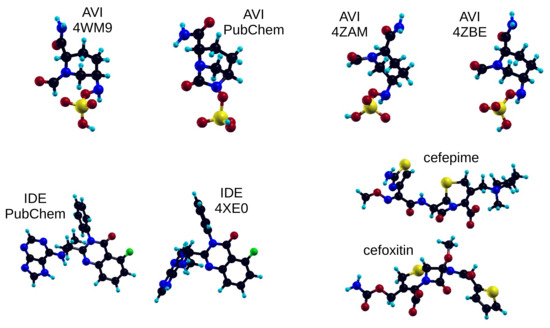 In Figure 1 we report the structural formula of the investigated molecules: avibactam, idelalisib, cefepime, and cefoxitin, and in Figure 2 we show the chosen geometries: four different conformers for the avibactam molecule (top panel), two conformers for the idelalisib molecule (left part of bottom panel) and one conformer each for the two chosen cephems, cefepime and cefoxitin (right part of bottom panel). The avibactam structures were taken from: Protein Data Bank (PDB) 4WM9 entry (Acinetobacter Baumanii OXA-24 complex with avibactam [29]), PubChem CID 9835049 (avibactam free acid), PDB 4ZAM (Crystal structure of SHV-1 beta-lactamase bound to avibactam [30]), PDB 4ZBE (Crystal structure of KPC-2 beta-lactamase complexed with avibactam [30]). The idelalisib structures were taken from: PubChem CID 11625818, PDB 4XE0 (Idelalisib bound to the P110 subunit of PI3K Delta [31]). The cefepime and cefoxitin structures were taken from the Antimicrobial Compounds Database maintained by G. Malloci (https://www.dsf.unica.it/translocation/db/, accessed on 4 August 2017 [32]).