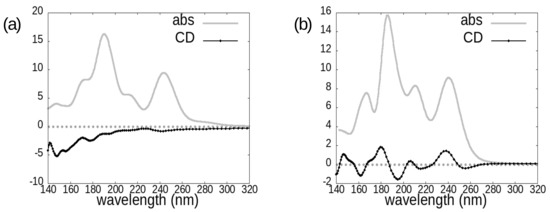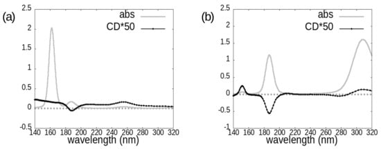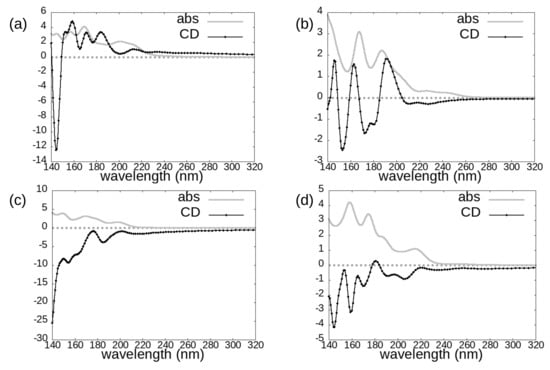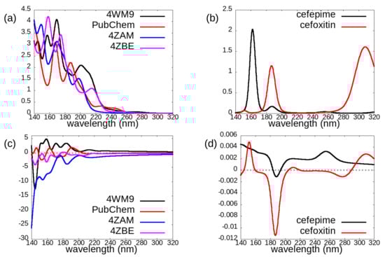By comparing the spectra of cefepime and cefoxitin (Figure 6b,d), we can instead evaluate the chemical sensitivity of optical properties for these molecules, which display several differences in chemical structure although belonging the same cephem family. Despite rather large differences, CD spectra (Figure 6d) of these two molecules display a common negative peak slightly above 180 nm and more in general they approximately share the pattern of sign variations across the 140–320 nm region: we can indeed identify a positive region for wavelengths below 180 nm, followed by a negative one between 180 and 200 nm: for wavelengths larger than 200 nm the dichroic signal of both molecules lacks strong negative features, although the cefepime spectrum (black line) is positive throughout this region, while the cefoxitin one (red curve) has negligible intensity in the 200 nm–260 nm range, and is slightly negative around 280 nm. On the contrary, the absorption spectra (Figure 6b) of these two cephems differ in number, position, and relative intensity of the few peaks present in the analyzed region.