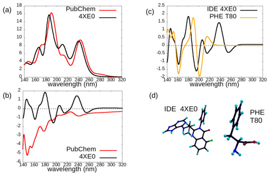 Interestingly (Figure 7c), the CD spectrum of one of the two studied conformations of the idelalisib molecule (PDB 4XE0, black curve) is quite similar, in the 140–210 nm range, to that of phenylalanine (PHE, orange curve), an amino acid molecule, in one of its two most populated conformers, as calculated by some of us in a previous work [13]. Indeed idelalisib and phenylalanine (Figure 7d) share a phenyl ring, although idelalisib is a larger and more complex molecule with respect to PHE. Moreover, the differences both between the CD spectra of the two analyzed idelalisib conformers (Figure 7b) and between the CD spectra of the two most populated PHE conformers (Figure 5B of [13]) are remarkably larger than the difference between the CD spectra of idelalisib and PHE in their conformations shown in Figure 7d.