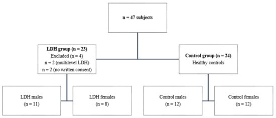 People (n = 47) seeking treatment for their LDH were recruited from the private physiotherapy clinic and the university in the period between June and August 2020. The study was registered before the enrollment (NCT04417855) number was obtained. Before the initiation of the study, each subject was informed regarding the study form and their right to refuse to participate or to withdraw at any time. All participants provided their informed consent prior to enrolment in the study, and the study procedures were approved by the Ethics Committee of the University School of Physical Education (Wroclaw, Poland) (14/2020). Several inclusion criteria were set including being aged between 18 and 35 years; reported pain of at least 2/10 on the Numeric Rating Scale (NPRS), which resulted in subjective disability within daily living activities; single-segment lumbar herniated disc confirmed by magnetic resonance imaging (MRI); and no acute stage of the pathology. Exclusion criteria were serious spinal pathology (i.e., metastatic disease, fracture), severe spinal deformity, spinal surgery history, pregnancy, or other disorders that would affect the outcome. The control group was formed of 24 healthy, asymptomatic individuals within the same exclusion criteria (Figure 1). Participant demographics are presented in Table 1.