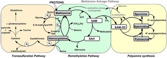 Methionine is a sulfur-containing, proteinogenic amino acid mainly provided by the diet. Its metabolism has a key role in the normal homeostasis of a cell, as it is a supplier of sulfur, propylamine groups, and methyl groups for the biosynthesis of different phospholipids, antioxidant nutrients, and compounds involved in deoxyribonucleic acid (DNA) transcription and ribonucleic acid (RNA) translation processes (Figure 1). Met is activated by adenosine triphosphate (ATP) in the presence of methionine S-adenosyl transferase, and then the resulting S-adenosylmethionine (SAM) can be demethylated into S-adenosylhomocysteine (SAH) by methyl transferases or decarboxylated into S-adenosylmethioninamine (SAM-DC) by SAM-decarboxylase [12]. By the decarboxylation reaction, SAM is involved in the synthesis of polyamines as an aminopropyl supplier. The polyamines spermidine and spermine are formed by the addition of aminopropyl groups, derived from SAM-DC, to the putrescine (Put) and Spd, respectively. These two reactions are mediated by spermidine and spermine synthases [13,14,15]. The byproduct of these two reactions is 5-methylthio adenosine, which is used for the re-synthesis of Met by the Methionine salvage pathway in several steps (not discussed in detail here) [16]. Polyamines are involved in multiple physiological processes, such as cell growth, proliferation, differentiation, immunity, migration, and gene regulation, as well as protein and nucleic acid synthesis [15].