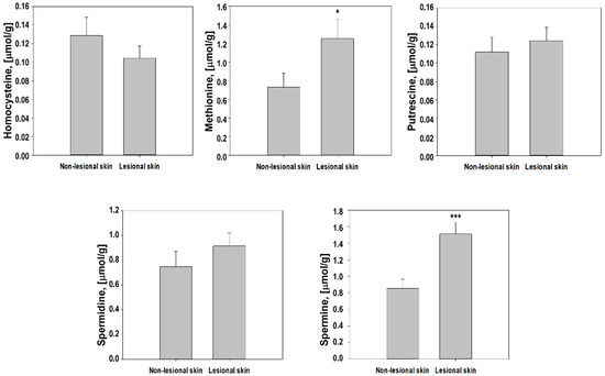 Comparison of homocysteine, methionine, putrescine spermidine, and spermine levels between non-affected skin and lesions from psoriatic patients. * Significantly different at p < 0.05; *** significantly different at p < 0.001.
