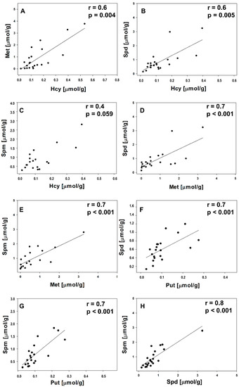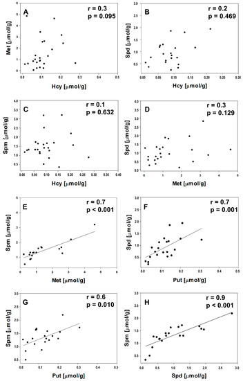 Correlation between Hcy/Met (A), Hcy/Spd (B), Hcy/Spm (C), Met/Spd (D), Met/Spm (E), Put/Spd (F), Put/Spm (G), and Spd/Spm (H) in lesions.