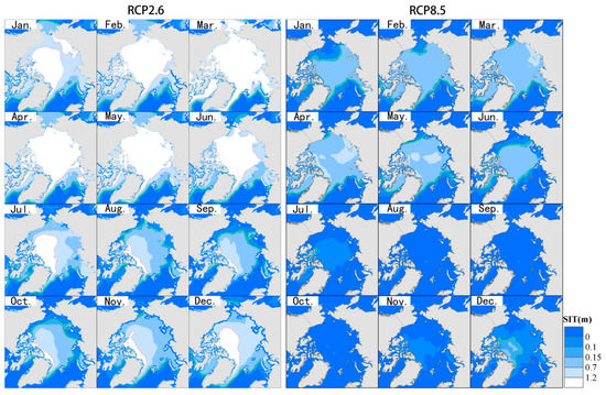 To simulate the sea routes in the year 2100, sea ice data for 2100 should be predicted. The Coupled Model Intercomparison Project Phase 5 (CMIP5) provided many models to simulate sea ice thickness (SIT) in the future under various representative concentration pathway (RCP) scenarios. In this study, we selected multiple models to eliminate the dispersion of different models (Table 3). The average of the models was applied in the route planning of this study. The models were selected following the method of Melia et al. (2016) [18] on ASR planning. In order to eliminate the bias of each model, these model outputs were corrected with the Pan-Arctic Ice Ocean Modeling and Assimilation System (PIOMAS). The models selected in this study are shown in Table 3. Additionally, we selected the highest emission pathway (RCP8.5) and the lowest emission pathway (RCP2.6) to simulate the routes. The seasonal average sea ice thickness distributions under RCP2.6 and RCP8.5 are shown in Figure 1. The seasonal shipping paths were planned based on the sea ice thickness.