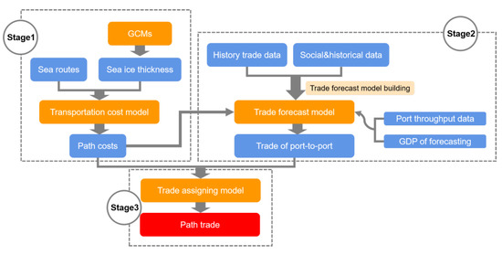 The forecast of trade via the ASRs in the long term was based on the cost between two ports and the throughput of ports. The cost of new paths in the Arctic needed to be calculated. Therefore, a transport cost model with path planning was built in this study. The port-to-port trade scale will change with the cost of trade declining when the ASRs open. Thus, a trade forecast model considering transit cost is developed in this study. To evaluate trade in the ASRs, a trade design based on shipping costs is applied in this study. Thus, according to the above considerations, we developed a three-stage model that adapts to long-term trade simulations. The three-stage model integrates transport cost calculation, trade forecast, and trade assignment. The transport cost calculation is based on ArcPy and NetworkX2.5. The trade forecast and trade assignment are calculated with Python 3.7.